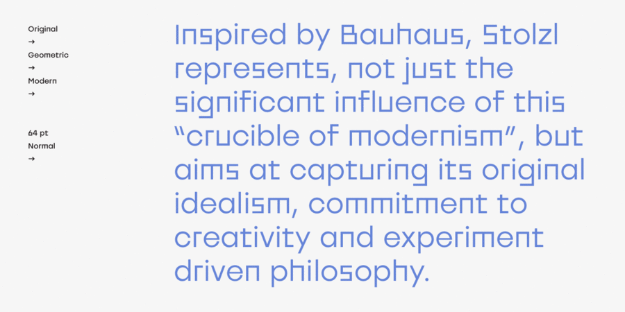 Stolzl Display is an original font family designed for headlines, titles and subtitles. Based on the combination of contrasting shapes, the harmony of form and rhythm is fundamental to the design. Inspired by Bauhaus, Stolzl represents, not just the significant influence of this “crucible of modernism”, but aims at capturing its original idealism, commitment to creativity and experiment driven philosophy. Details include six weights, cyrillic, 480 characters with Cyrillic, alternative glyphs, manually edited kerning and Opentype features. Named after Gunta Stölzl, the Bauhaus’s only female master. Designed by Mariya Pigoulevskaya in 2015. Stolzl Display™ is a trademark of The Northern Block.
