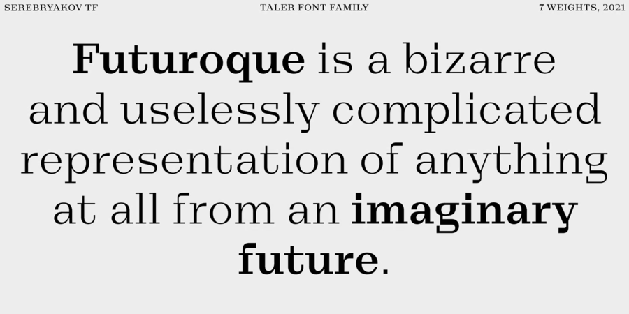 Taler is a serif typeface represented by seven weights. It was conceived as a continuation of the sans-serif typeface Nekst. In the process of design it became clear that it is a completely different typeface. The rectangular, slightly elongated serifs, the plastic stiffness, and the combination of different styles make Taler a true representative of contemporary. It's old-fashioned and modern, it's for a display titles and for plain text, it's rough and elegant — it's all present in it’s design at the same time. The duality of it nature is it peculiarity. Taler was designed by Denis Serebryakov in 2021.