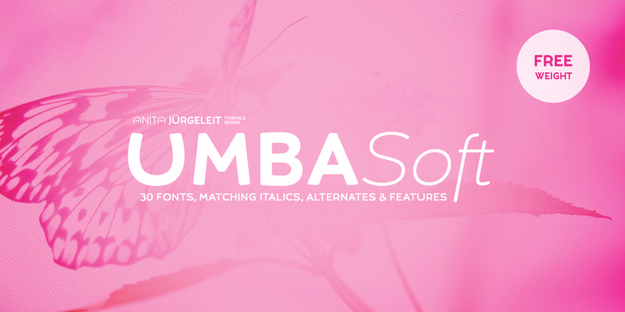 UMBA Soft is a mellow sans serif typeface designed by Anita Jürgeleit. It soothes your design and helps to create a balance your visualization. Do you need a type for young cosmetics or other youth-related products? Your creation should be soft and gentle and you need a suitable font? Something that should be cuddly, sweet and soft but a serious type family that covers all your concerns? Umba Soft is your match! Your typographic composition will improve with your new favourite font.