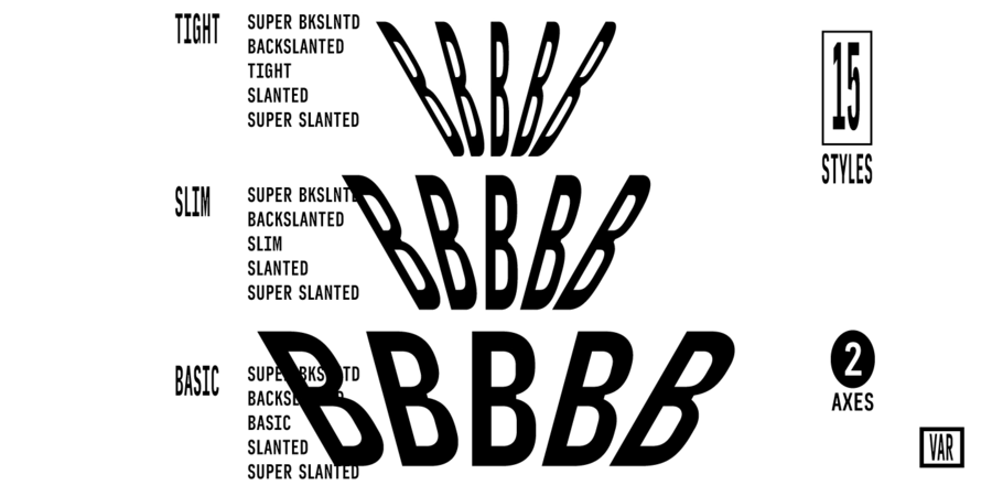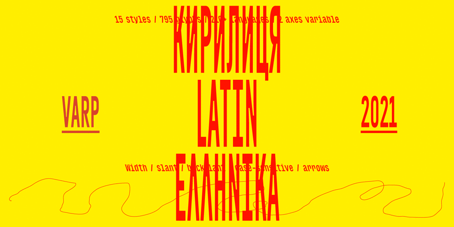 Varp is a narrow 2-axis variable geometric typeface with slight reverse contrast inspired by utilitarian and technical design. In Slim and Tight styles, the reverse contrast is enhanced. Typeface is adjustable in width, as if by mechanical deformation of proportions, which is often found in technical and transport markings. The letterforms are based in part on the shapes of DIN fonts, with the deliberate addition of contrasting connections, sharp spurs and massive ink traps for sharpness. With the help of special spacing, selective kerning and adjusted letter width, the effect of a monospaced font is created with no obvious "holes" in the text set, while maintaining a special rhythm. In addition to the width, Varp is adjustable in tilt angle to an extreme 30 degrees and an intermediate 15 degrees in both directions. A font style Varp Slim Super Back Slanted is free for unlimited use under the "Desktop" and "Web" licenses. The typeface was designed by Maksym Kobuzan in 2021.