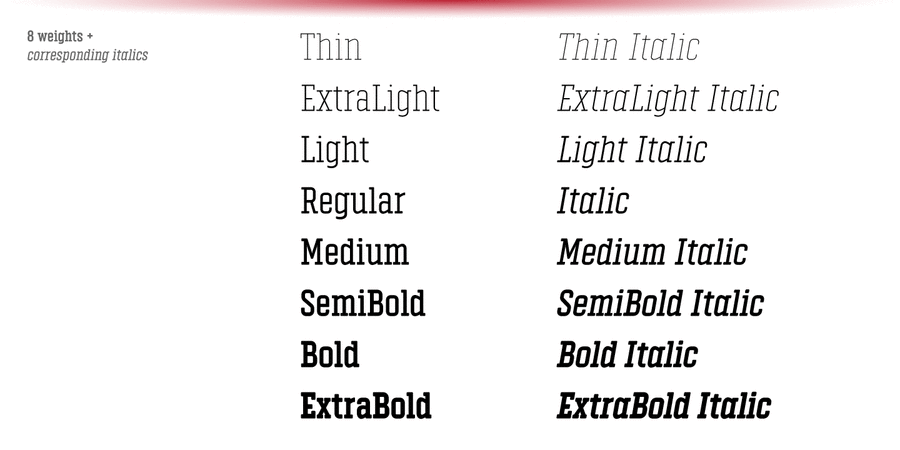 Vin Slab Pro is a condensed rigid slab-serif with extra-large x-height and rounded corners. It is designed specifically for short texts to add significance and emphasis. Vin (translated from Ukrainian as “he”) is a superfamily consisting of three robust typefaces with pronounced vertical stems and rounded corners. All three typefaces feature very large x-height for even more expression and assertiveness. Be sure to check other two typefaces of Vin superfamily: Vin Sans Pro and Vin Mono Pro. The typeface was designed by Oleh Lishchuk at Mint Type foundry in 2018.
